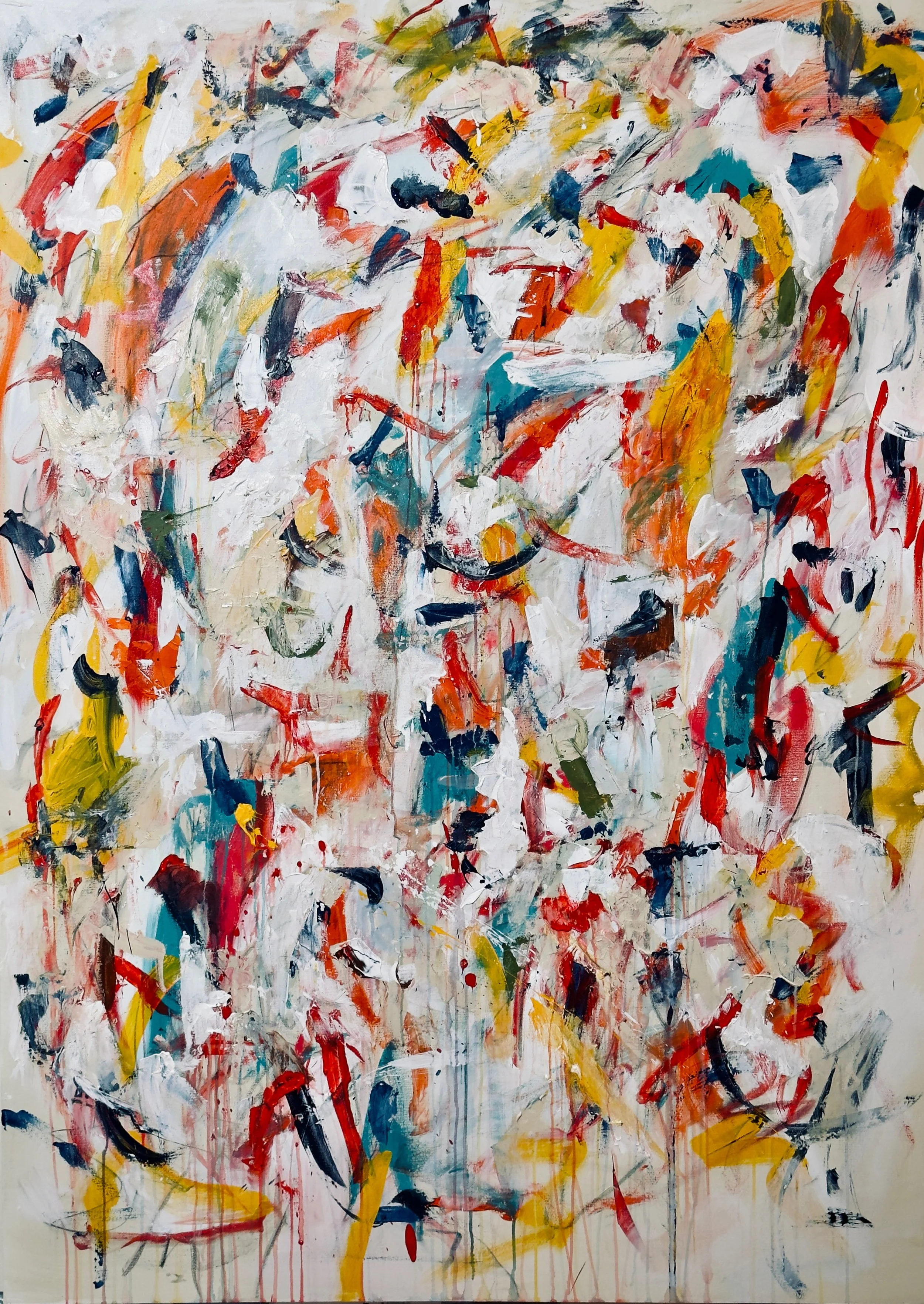 Artist shows a range of technique, boasting abstracted compositions exploding with color— masterfully controlled, gestural, chaotic but with discernment. Other compositions depict whimsical woodland characters whose form melt, bend and overlap. Some imagery is unapologetically suggestive, almost legitimizing instinctual desire. One could interpret the subjects representing natural desires unhinged by social policing, or a rejection of western moral hegemony? Or darker maniacal forces are at play.